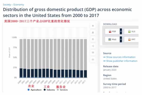 这种看法有一定的道理,但是并不是美国的全貌,也经不住细致的分析,虽然现在的美国确实将大量的工厂搬出了美国,转移到了其他国家,但是也必须看到,在美国目前的GDP构成当中,其制造业依然占据了将近20%的份额,用其庞大的GDP总量19.39万亿美元(2017年)乘以20%,就是约3.87万亿美元。