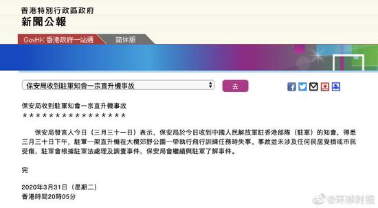 据香港政府新闻处31日通报,香港保安局发言人今日(3月31日)表示,保安局于今日获悉,中国人民解放军驻香港部队(驻军)一架直升机在大榄郊野公园一带执行飞行训练任务时失事。事故并未涉及任何民居受损或市民受伤。