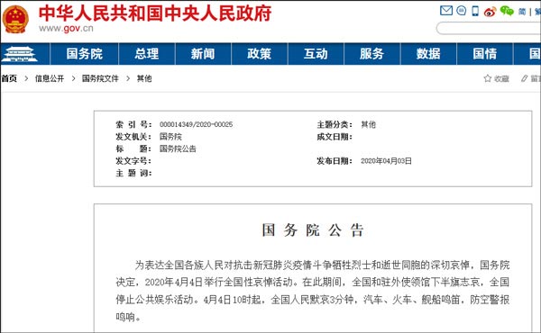 中国政府网4月3日发布公告,为表达全国各族人民对抗击新冠肺炎疫情斗争牺牲烈士和逝世同胞的深切哀悼,国务院今天发布公告,决定2020年4月4日举行全国性哀悼活动。在此期间,全国和驻外使领馆下半旗志哀,全国停止公共娱乐活动。4月4日10时起,全国人民默哀3分钟,汽车、火车、舰船鸣笛,防空警报鸣响。