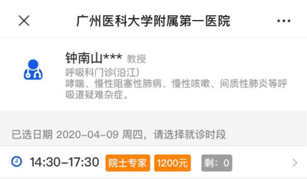 据广州医科大学附属第一医院官网显示,钟院士出诊时间为每周四下午。该院官方微信门诊挂号通道也显示,2020年4月9日(周四)有钟院士的专家门诊,但剩余号数显示为“0”。关于钟院士何时出诊以及如何安排,健康时报记者致电广州医科大学附属第一医院呼吸科门诊部,工作人员告诉记者,钟院士会有出诊,但是具体的出诊时间是由钟院士团队团队统一安排的。但是工作人员称,由于目前仍处于疫情期间,钟院士主要精力在抗疫一线,钟院士出诊至少需要等到疫情结束。