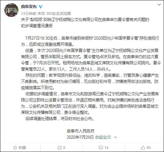 7月27日18:30左右,曲阜市接到举报称“2020阳光少年国学夏令营”存在违规行为,迅即成立调查组展开调查。