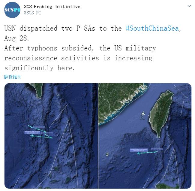 据“南海战略态势感知”计划平台8月28日发布的消息,当天上午两架美国海军P-8A反潜巡逻机途径巴士海峡进入南海。据飞行路线图显示,这两架美国海军P-8A巡逻机分别于上午8点和上午8点半左右进入南海。“南海战略态势感知”计划表示,在台风过后,美军机在南海的侦察行动明显增加。