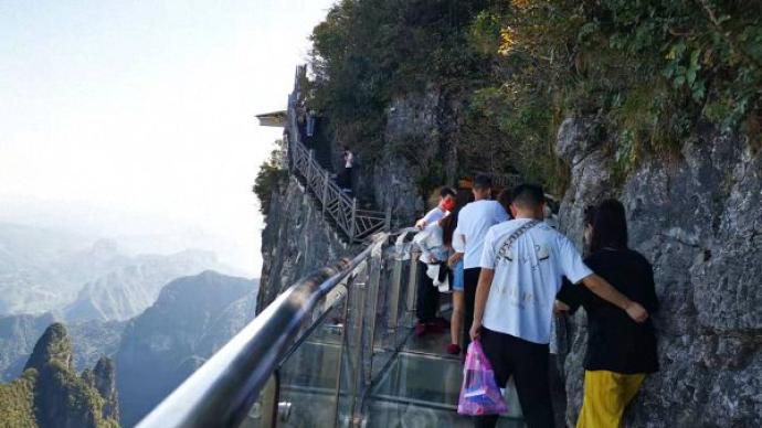 而在天门山的盘龙崖玻璃栈道,不时传来游客们的欢声笑语。一位女游客笑着捶打她丈夫,“你不理解我们恐高的人,我吓掉半条命,回去还要收魂。”
