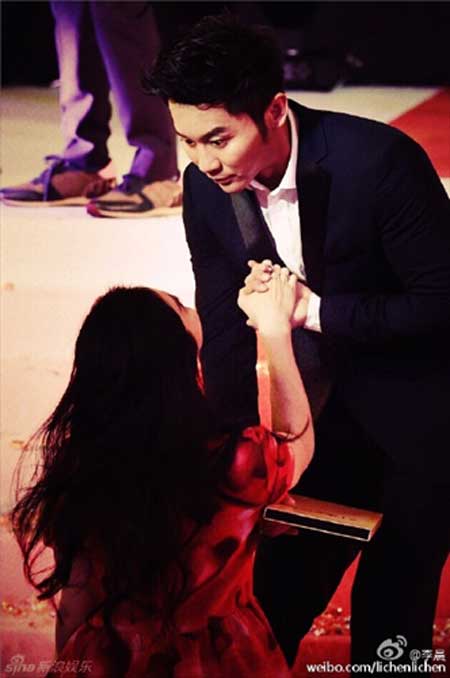 李晨通过微博发布一组和女友范冰冰一起参加活动的照片,并留言称:“女神一样的女友走的好好的突然就跪下来了,吓死牛了。只能补上一句:这头发甩的,你值得拥有。”