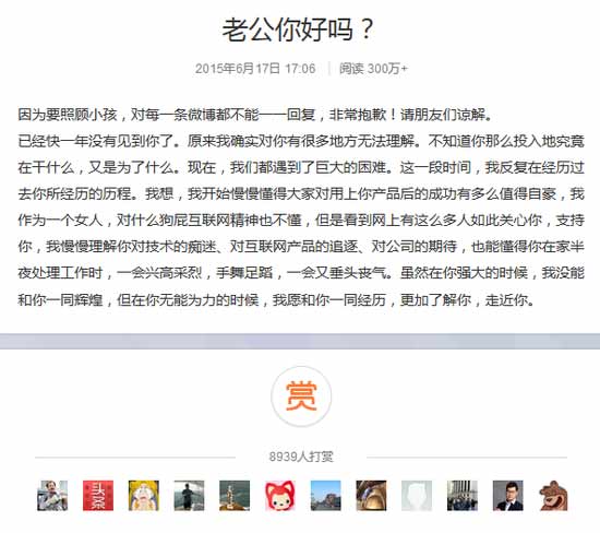 注册微博第一天收获8万粉丝,第一条微博转发量达3万次评论2万次,第一篇长微博不到一小时获超过1千人打赏,这些都是前快播CEO王欣的太太创下的“壮举”。昨日(6月17日)下午17:06,刚开微博的前快播CEO王欣太太发表名为《老公你好吗?》的长文章。截至观察者网发稿,阅读量已超300万,共8939人对该文章打赏。有趣的是,在打赏名单中,还出现了58同城CEO姚劲波等。