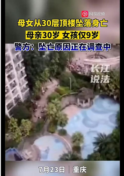 7月24日下午,有网友发布消息爆料称,在山城重庆发生一起坠楼事件,一对母女从30楼坠落身亡,造成两人当场身亡。该网友还配发了一段现场视频,进一步证实了消息的真实性和可靠性。